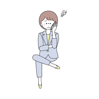 座ってスマホで電話しながら困っているスーツの女性のイラスト