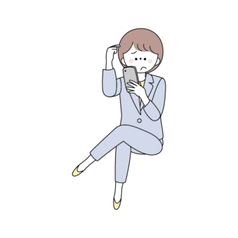 スマホをしながら困っている足を組んで座っているスーツの女性のイラスト